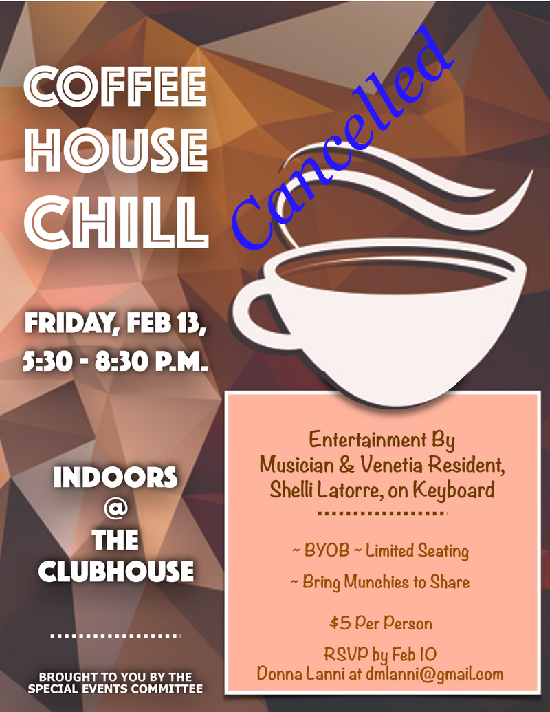 Villa Vivaci Board Meeting Venetia Clubhouse 10:00 AM to Noon Eileen Mahoney Venetia Clubhouse 3:30 to 5:00 PM Contact Alex Sarelas for further information: CDA Landscaping Committee Meeting Venetia Clubhouse CDA Landscaping Committee Meeting 9:00 AM Jennifer Smouse VCA Finance Committee Meeting Venetia Clubhouse 10:30 AM to 12:30 PM Roger DeNiscia Sr Cancelled Private Event Venetia Clubhouse (only in case of rain) 4:00 to 7:00 PM Sue Caruso